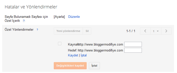 Yönlendirmek istediğiniz sayfanın bağlantısını(blog’unuzun ana sayfasının linki olmadan) ilk satıra yazıyorsunuz(Kaynak), bu sayfaya girildiğinde otomatik olarak yönlendirilmesini istediğiniz sayfanın bağlantısını da ikici satıra(Hedef) yazıyorsunuz.